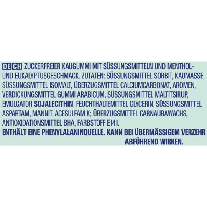 Zutaten: Süßungsmittel Sorbitol, Kaumasse, Süßungsmittel Isomalt, Überzugsmittel Calciumcarbonat, Aromen, Süßungsmittel Maltitsirup, Verdickungsmittel Gummi Arabicum, Emulgator SOJALECITHIN, Feuchthaltemittel Glycerin, Süßungsmittel Aspartam, Acesulfam K, Farbstoff E171, Überzugsmittel Carnaubawachs, Antioxidationsmittel BHA, Farbstoffe E133, E160a
