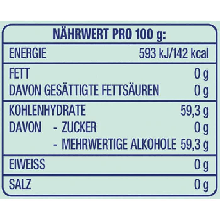 Enthält eine Phenylalaninquelle. Kann bei übermäßigem Verzehr abführend wirken.