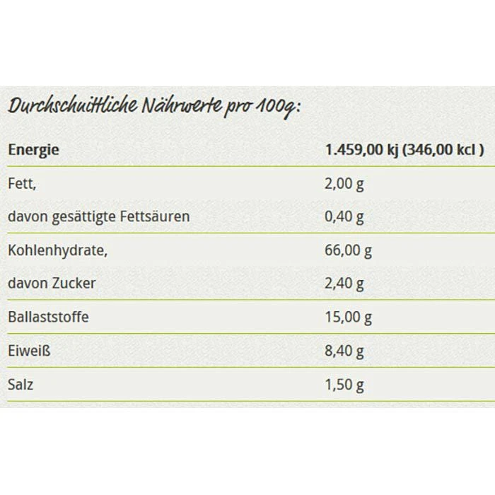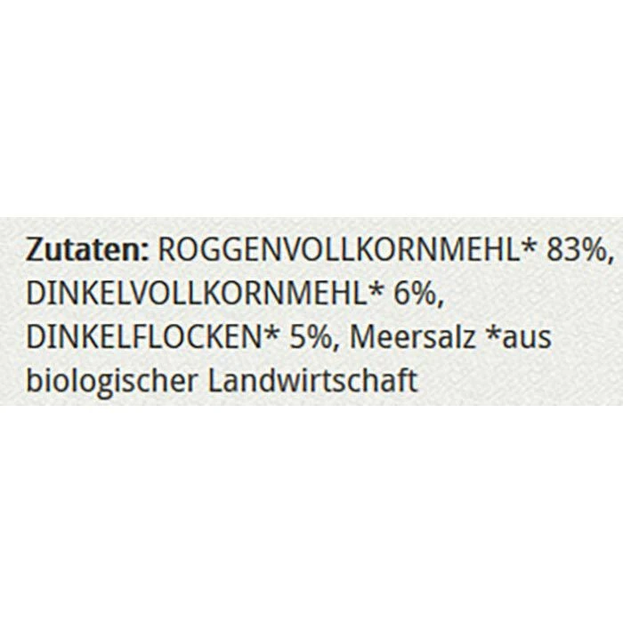 Zutaten: ROGGENVOLLKORNMEHL* 83%, DINKELVOLLKORNMEHL* 6%, DINKELFLOCKEN* 5%, Meersalz