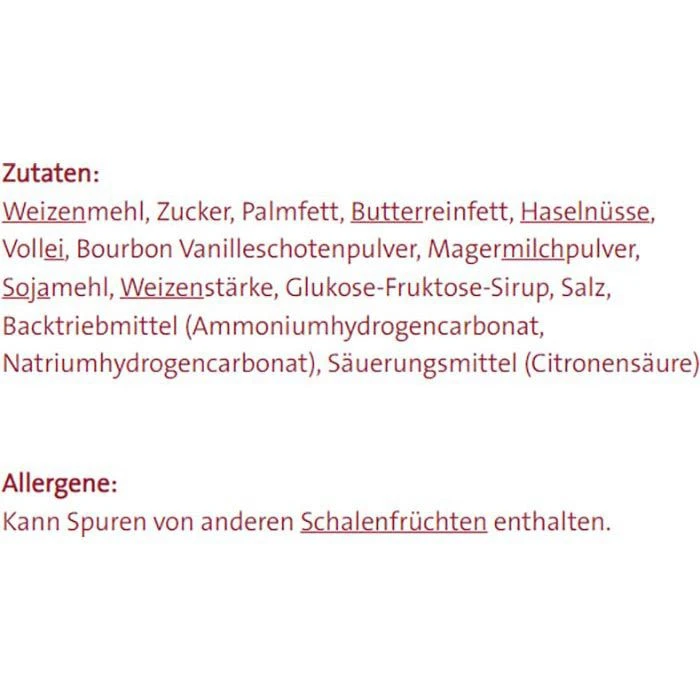 Zutaten: WEIZENMEHL, Zucker, Palmfett, BUTTERREINFETT, HASELNÜSSE, VOLLEI, Bourbon Vanilleschotenpulver, MAGERMILCHPULVER, SOJAMEHL, WEIZENSTÄRKE, Glukose-Fruktose-Sirup, Salz, Backtriebmittel (Ammoniumhydrogencarbonat, Natriumhydrogencarbonat), Säuerungsmittel (Citronensäure).