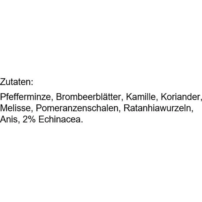 Zutaten: Pfefferminze, Brombeerblätter, Kamille, Koriander, Melisse, Pomeranzenschalen, Ratanhiawurzeln, Anis, 2% Echinacea.