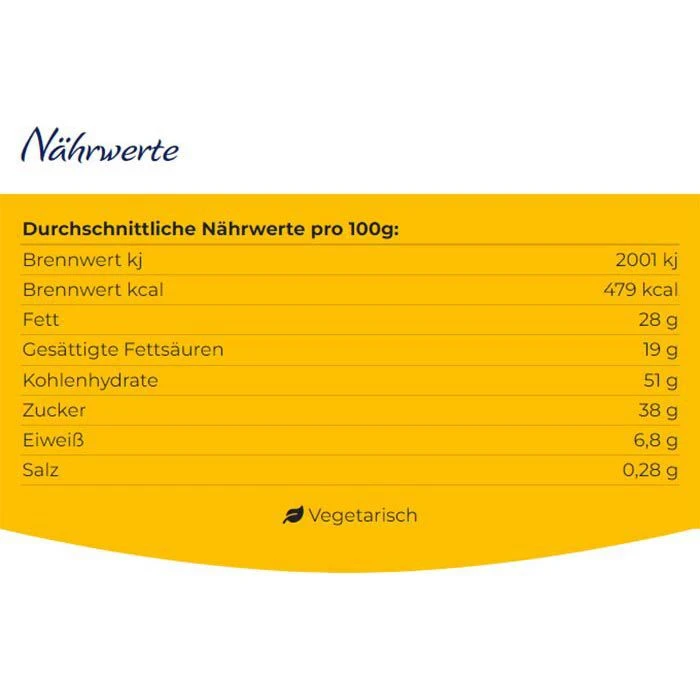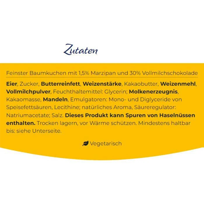 Zutaten: EIER, Zucker, BUTTERREINFETT, WEIZENSTÄRKE, Kakaobutter, WEIZENMEHL, VOLLMILCHPULVER, Feuchthaltemittel: Glycerin; MOLKENERZEUGNIS, Kakaomasse, MANDELN, Emulgatoren: Mono- und Diglyceride von Speisefettsäuren, Lecithine; natürliches Aroma, Säureregulator: Natriumacetate; Salz. Dieses Produkt kann Spuren von Haselnüssen enthalten. Trocken lagern, vor Wärme schützen.