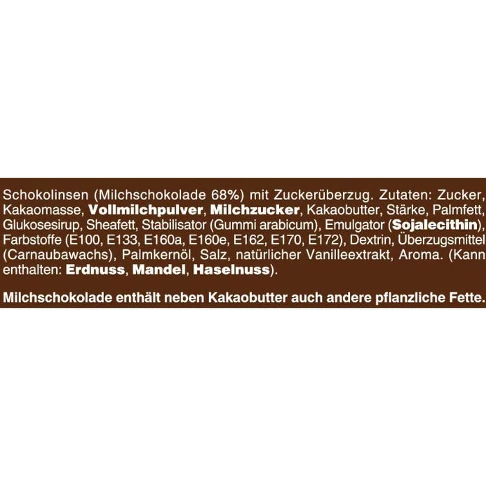 Zutaten: Zucker, Kakaomasse, VOLLMILCHPULVER, MILCHZUCKER, Kakaobutter, Stärke, Palmfett, Glukosesirup, Sheafett, Stabilisator (Gummi arabicum), Emulgator (SOJALECITHIN), Farbstoffe (E100, E133, E160a, E160e, E162, E170, E172), Dextrin, Überzugsmittel (Carnaubawachs), Palmkernöl, Salz, natürlicher Vanilleextrakt, Aroma.