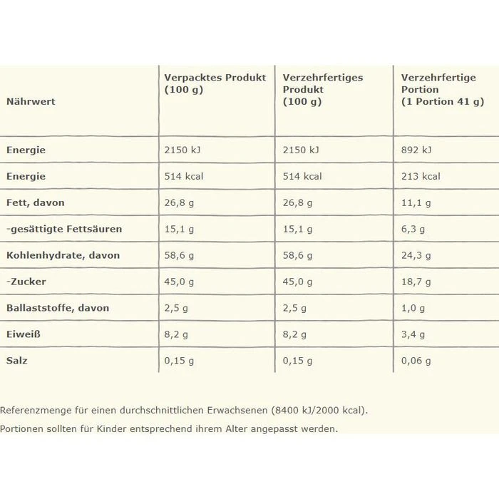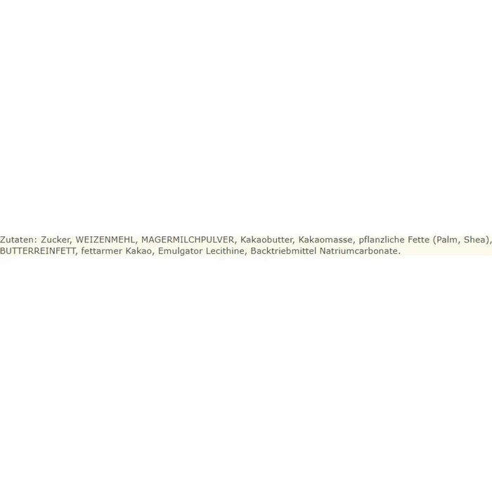 Zutaten: Zucker, WEIZENMEHL, MAGERMILCHPULVER, Kakaobutter, Kakaomasse, pflanzliche Fette (Palm, Shea), BUTTERREINFETT, fettarmer Kakao, Emulgator Lecithine, Backtriebmittel Natriumcarbonate
