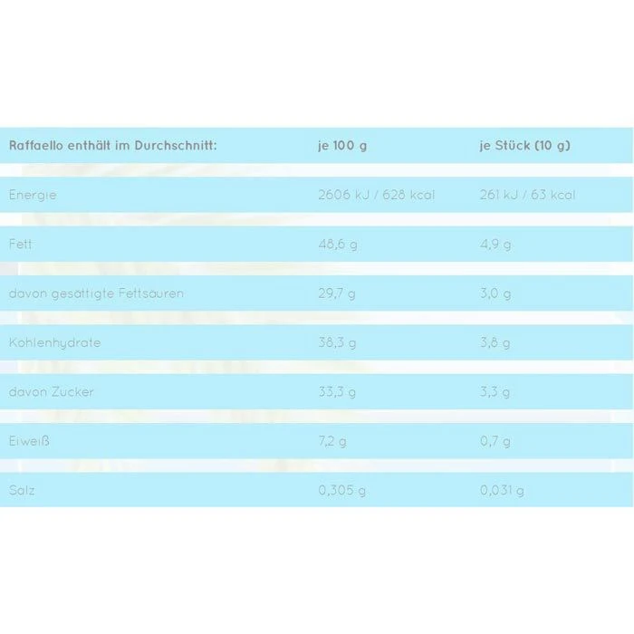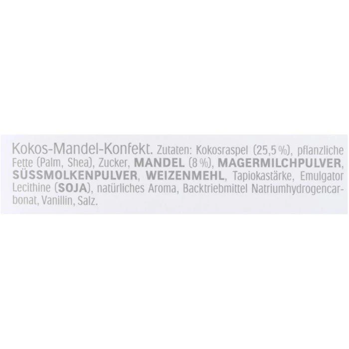 Zutaten: pflanzliche Fette (Palm, Shea), Kokosraspel (23,5%), Zucker, MANDEL (8%), MAGERMILCHPULVER, SÜßMOLKENPULVER, WEIZENMEHL, natürliches Aroma, Emulgator Lecithine (SOJA), Backtriebmittel Natriumhydrogencarbonat, Salz, Vanillin