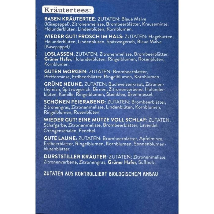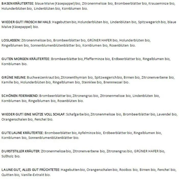 • Mischung aus Kräuter-, Schwarz-, Weiß-, Grün- und Früchtetee